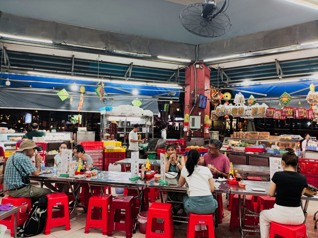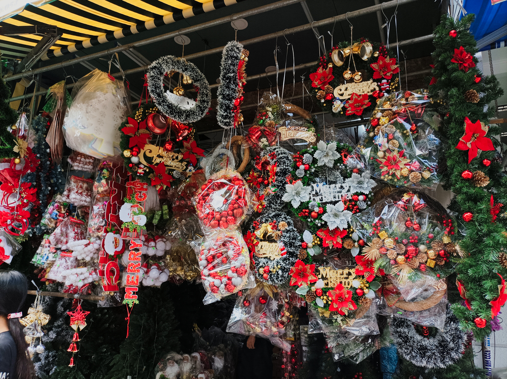 Po wejściu do serca dzielnicy natrafiamy na przeróżne sklepy, w których można kupić dosłownie wszystko. Mógłbym się kręcić godzinami po uliczkach tej dzielnicy i chyba by mi się nie znudziło. Inna sprawa, że mógłbym mieć później problem uciągnąć walizkę, bo raczej z pustymi rękami bym stamtąd nie wyszedł. Niestety nie mieliśmy aż tyle czasu. No i całe szczęście, że w głowie pojawiły się głosy rozsądku, które to przypomniały mi, że zakupy robimy tuż przed wylotem w Hanoi. Z ciekawostek powiem Wam, że jest to też pierwsze miejsce w 2023 roku, w którym natknąłem się na świąteczne ozdoby i piosenki. Było to dość ciekawe zjawisko biorąc pod uwagę 40 stopni na plusie.