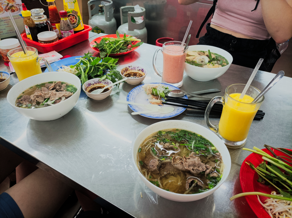 Ceny w menu jeszcze bardziej nas utwierdziły w tym przekonaniu. Nadszedł czas na porządnego klasyka jakim jest zupa Pho, czyli coś rodzaju naszego rosołu na bulionie wołowym. Do tego jest makaron ryżowy, mięso do wyboru (w naszym przypadku wołowina) i zielenina. Dodatkowa porcja ziół oraz kiełki fasoli mung podawane są na osobnym talerzu.