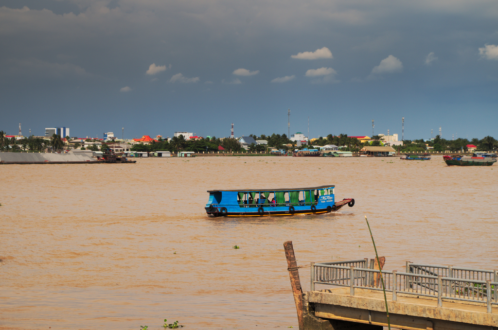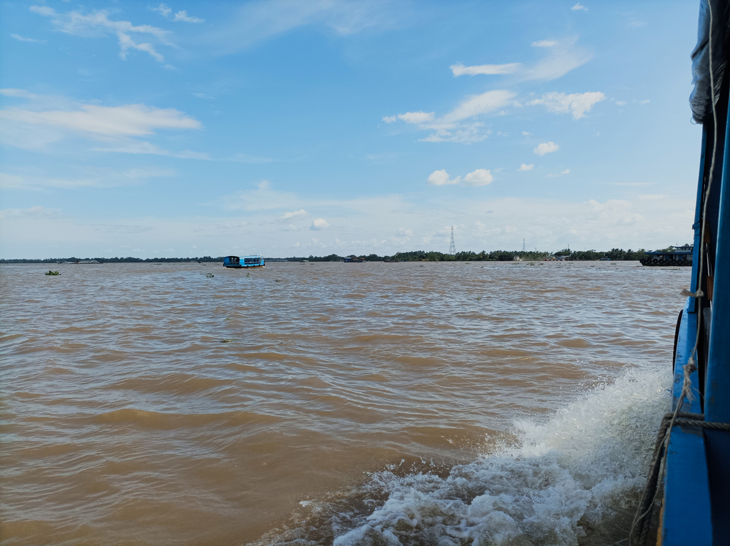 W miejscowości My Tho przesiedliśmy się na niewielką łódź, którą przepłynęliśmy Mekong wszerz w celu dostania się na jedną z wysp. Trochę niepokojąco wyglądało przy tym niebo, na którym rysowały się kształty superkomórki burzowej. Mieliśmy jednak nadzieję, że pogoda wytrzyma tą część wycieczki, tym bardziej, że wkrótce czekała nas kolejna atrakcja.