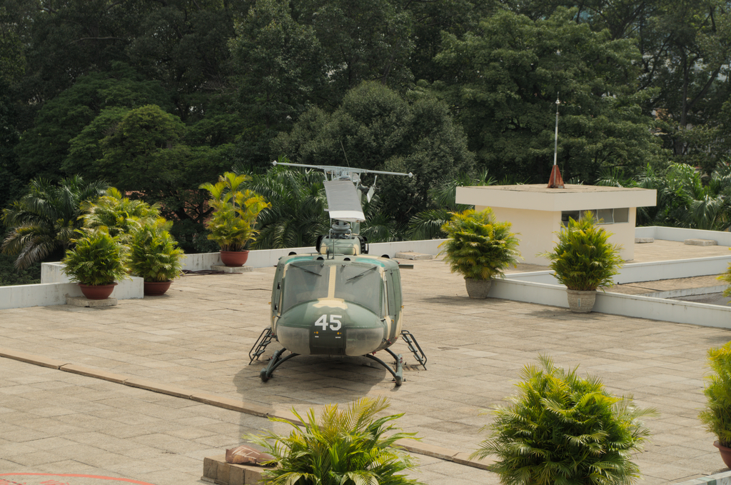Następnie przeszliśmy do części Pałacu, w której znajdowała się część mieszkalna z sypialniami, salonem gier, a nawet kinem. Na dachu mieliśmy okazję zobaczyć helikopter, który zawsze tutaj stacjonował i był gotowy do startu o każdej porze dnia i nocy, w razie, gdyby prezydent musiał gdzieś się przemieścić. Zaraz koło śmigłowca znajdują się dwa okręgi, które wskazują punkty, na które zostały zrzucone bomby podczas próby zamachu w dniu 8 kwietnia 1975.