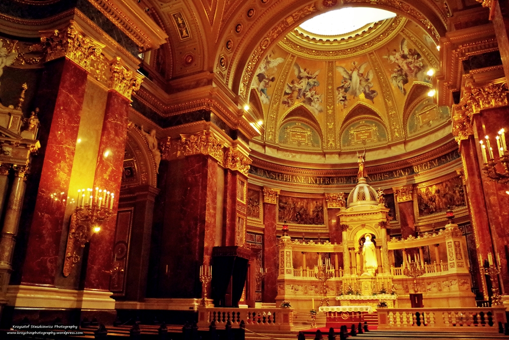 Idziemy, idziemy, idziemy i idziemy i w dalszym ciągu idziemy wzdłuż ruchliwej ulicy i zastanawiamy się, czy oby na pewno to właściwy kierunek, przecież bazylika jest duża, już powinniśmy ją widzieć, dochodzimy do skrzyżowania i nagle przed nami wyrasta… kolos, bo inaczej chyba nie potrafię określić wielkości tej bazyliki.. toż to olbrzym, ,,będzie go ciężko sfotografować” – pomyślałem i… po 5min okazało się, że niewiele się pomyliłem. Musieliśmy dość sporo odejść od bazyliki by sfotografować ją od strony głównego wejścia, choć i to wyszło dość przeciętnie. Następnie weszliśmy do neorenesansowej bazyliki. Bazylika była budowana przez 54 lata, od 1851r do 1905r i jest poświęcona pierwszemu królowi węgierskiemu Stefanowi I. Bazylika mając wysokość 96m (z kopułą), jest trzecim najwyższym budynkiem na Węgrzech. Do Bazyliki może wejść jednocześnie 8500 osób.