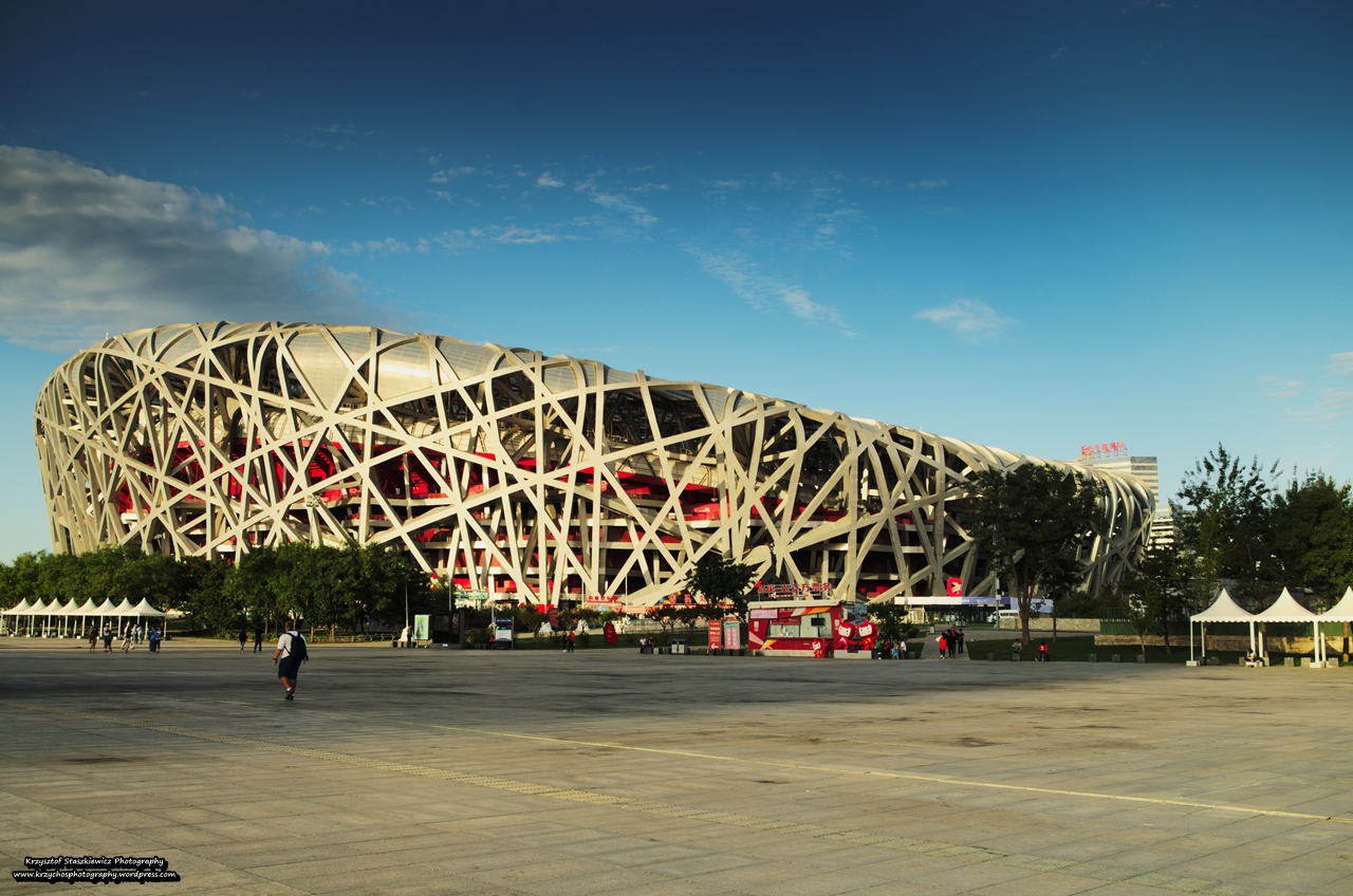 Po wyjściu spod stadionu skręciliśmy w prawo i już po chwili w blasku zachodzącego słońca, pojawiło się gniazdo, Ptasie Gniazdo, czyli główny Stadion, na którym odbywały się imprezy sportowe oraz otwarcie Igrzysk Olimpijskich w Pekinie. Przez cały Park Olimpijski prowadził nas szeroki, a wręcz bardzo szeroki deptak, a w tle z głośników były odtwarzane piosenki, które były związane z tymi igrzyskami. Z jeden strony Ptasie Gniazdo, z drugiej Basen Olimpijski, wieże olimpijskie, sklepy z pamiątkami, rzeźby maskotek olimpijskich, tylko nie wiedzieć gdzie w tym wszystkim zgubiliśmy znicz olimpijski ☹