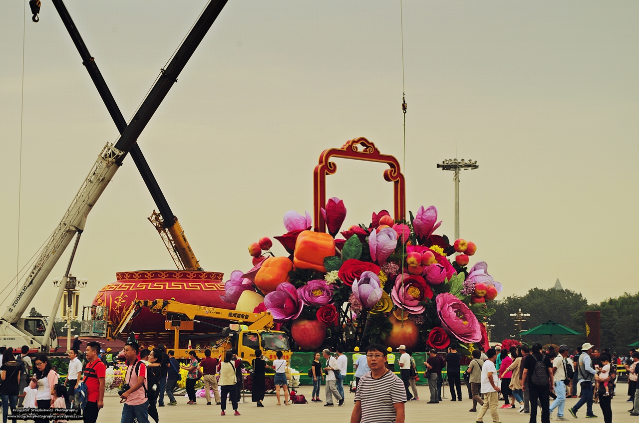 Dzisiaj to miejsce jest pełne turystów, których oczy skierowane są głównie na bramę Tiananmen na której (nad wejściem) powieszony jest portret Mao Zedonga. W sumie nasze oczy (i obiektywy) były skierowane dokładnie w tą samą stronę, co reszty turystów, aczkolwiek jeszcze jedna rzecz przykuła moją uwagę. Otóż za naszymi plecami, na placu coś się działo, jakieś dźwigi ustawiały jakieś gigantyczne rzeźby, niektóre przypominające kwiaty, inne jeszcze coś innego. W tym momencie uświadomiłem sobie, że zbliża się niezwykle ważne święto, którym jest święto jesieni. Z dnia na dzień było widać coraz większe postępy w przystrajaniu miasta, ale o tym wspomnę przy okazji ostatniego dnia.
