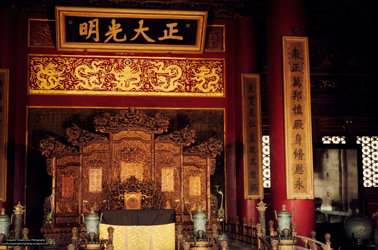 Kolejnym przystankiem był Pawilon Najwyższej Harmonii, w której to cesarz wraz z ministrami dyskutował na tematy wagi państwowej. Osobiście uważam, że jest to najpiękniejszy budynek w całym kompleksie, swoją wielkością wręcz przytłacza. Do bramy prowadzą schody, a koło nich można podziwiać starożytne gary do gotowania pomidorówki naczynia z brązu, a dokładnie 18 naczyń, które mają symbolizować 18 prowincji. Po wyjściu po schodkach oraz przeciśnięciu się przez chińczyków, naszym oczom pokazał się olbrzymi cesarki tron. Zdjęcia tego tak nie oddają, ale na żywo wygląda świetnie.
