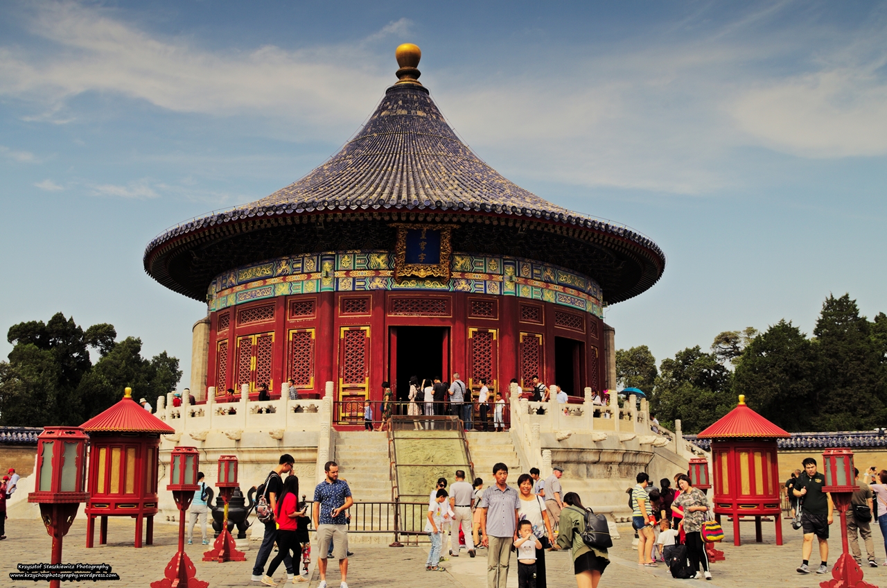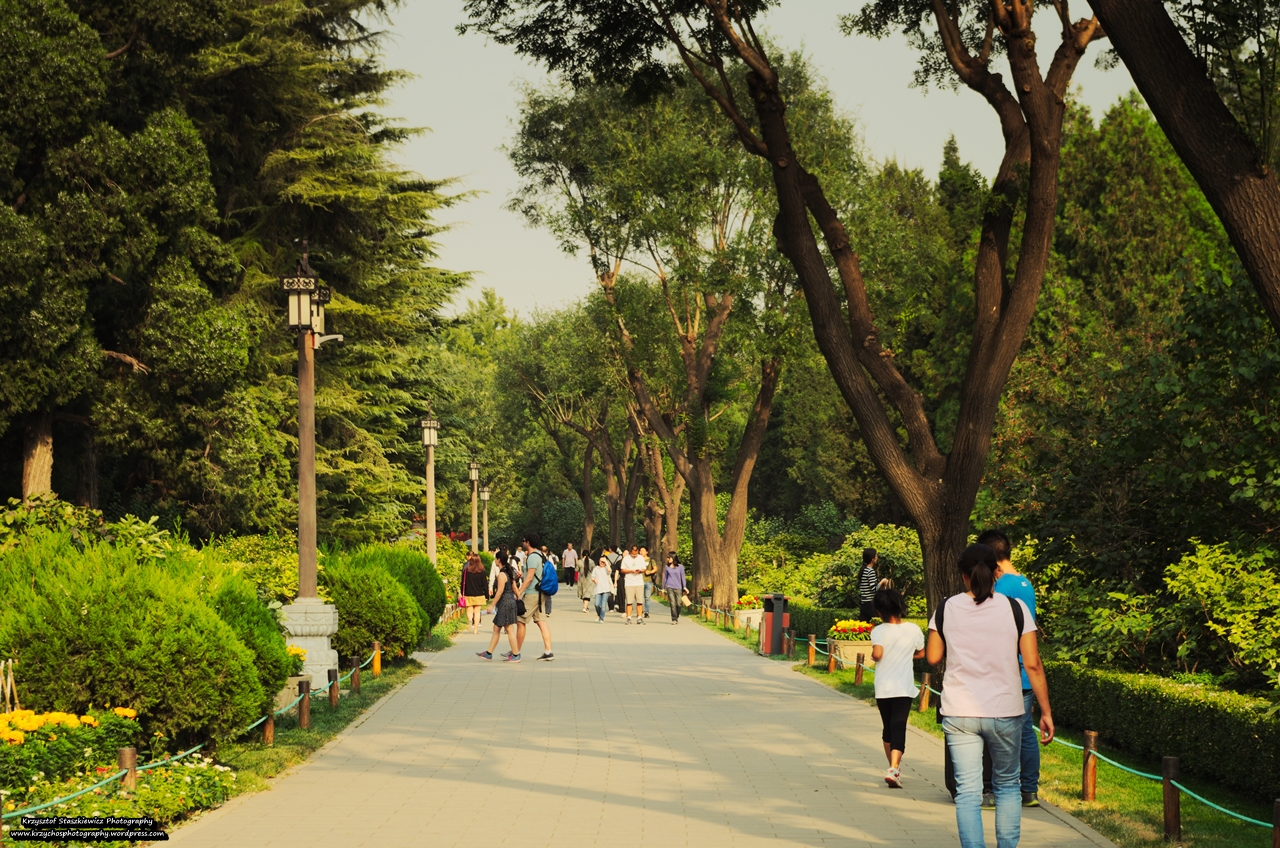 Drugi dzień zaczęliśmy od przejazdu metrem, w którym zdziwiłem się nieco faktem, że było dość luźno (raczej nastawiałem się na upychanie się na siłę do wagonów). Po krótkiej przejażdżce i spacerze, doszliśmy do celu, jakim jest Park Tiantan. Jest to ogromy kompleks świątyń oraz park o powierzchni 270ha. Był to kompleks świątyń, w których Cesarz Chin (uważany za Syna Niebios i pośrednika między Ziemią, a Niebem) w okresie przesilenia zimowego dziękował w imieniu ludu za plony, natomiast w pierwszym miesiącu danego roku księżycowego (dokładnie 15 dnia tego miesiąca) składał modły o urodzaj w nadchodzącym roku.