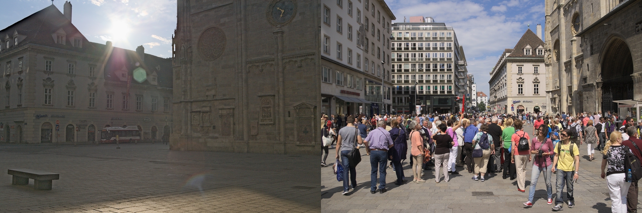 Po ok. 7h jazdy, ok 40min przed planowanym przyjazdem, dojechaliśmy do Wiednia. Pierwsze co rzuciło mi się w oczy to oflagowany tramwaj. Szybka burza mózgów i już wiedzieliśmy co to za flagi, jedna z nich to flaga Wiednia (no, o tym to akurat wiedziałem), a druga flaga… gejów. Otóż okazało się, że trafiliśmy na dzień w którym jest… parada równości (Raaany Boooskie, wszystko tylko nie to). Po wyjściu z autokaru, poszliśmy do metra, którym w ok 5min dojechaliśmy do pierwszego punktu programu, czyli Stephanplatz wraz z katedrą Św. Szczepana. Czemu akurat tam? Ponieważ katedra jest otwarta od godziny 6 rano, a poza tym o tej porze nie ma tam prawie nikogo (dotyczy to zarówno Stephandom, jak i Stephanplatz).