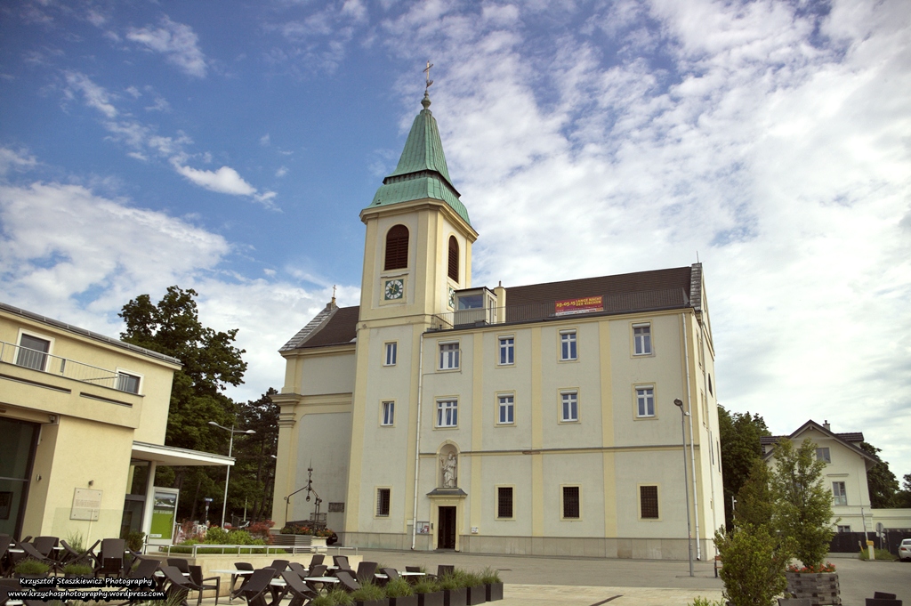 Zrobiliśmy trochę zdjęć i udaliśmy się do stacji metra linii U4, którą pojechaliśmy na końcową stację, by przesiąść się na linię autobusową 38A i pojechać nią na wzgórze Kahlenberg. Po dojeździe i próbie nie uśnięcia w autobusie, poszliśmy do kościoła pod wezwaniem św. Józefa. Jest to kościół w którym czytano msze na intencję króla Jana Sobieskiego przed zwycięską bitwą z Turkami w 1683r. Jest to polski kościół, praktycznie wszędzie słychać polskie głosy, odbywają się tutaj także msze po Polsku. W środku kościółek jest bardzo skromny, nie ma zbędnego przepychu, nawet organy są malutkie… Zresztą z zewnątrz budynek w ogóle nie przypomina kościoła.