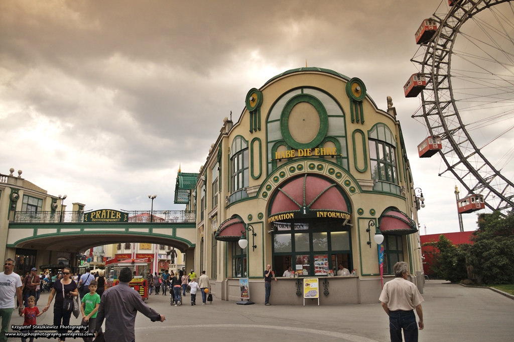 Po dojściu z przystanku do Stadionu stwierdziliśmy, że nie mamy siły wracać, w związku z tym pojechaliśmy pociągiem parkowym do Wesołego Miasteczka (2,20 Euro na odcinku Stadion-Wesołe miasteczko). Widząc atrakcje jakie tam są nie mogłem się powstrzymać i ruszyłem na huśtawkę, która w skrajnych wychyleniach robi obroty… od razu się obudziłem, ale również zauważyłem jedną rzecz, która mi podpowiedziała, że trzeba się zwijać szybko do metra, otóż do Wiednia zbliżała się ściana deszczu. Po zejściu z huśtawki od razu udaliśmy się do metra. Co do Prateru warto zwrócić uwagę na diabelski młyn, który powstał w 1897 roku dla uczczenia 50 jubileuszu cesarza Franciszka Józefa I.